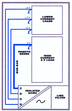 Структурные типы систем питания показаны на рис. 2а (централизованная система) и рис. 2б (распределенная система). Повышение напряжения на общей шине распределенной системы до 40...60 В вместо 5 В снижает на порядок величину тока. Это упрощает конструкцию шины, системной объединительной платы и устройств подачи напряжения к печатным платам.