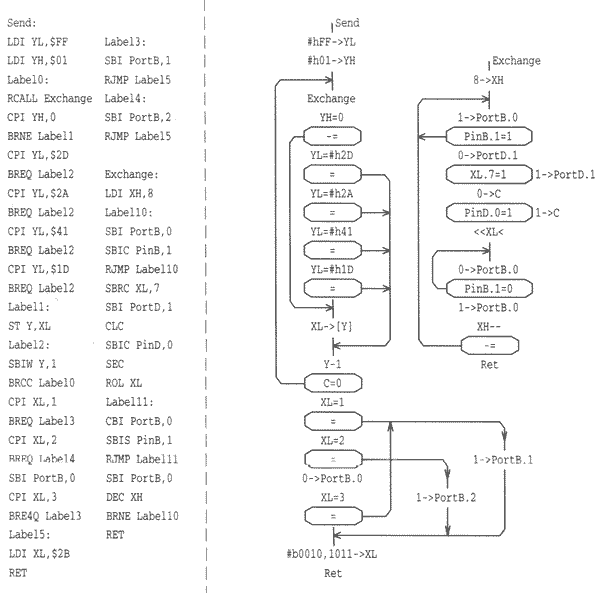 На рис. 2 приведен более сложный пример фрагмента программы. Слева — в классическом ассемблере, а справа — полная его копия в Algorithm Builder.