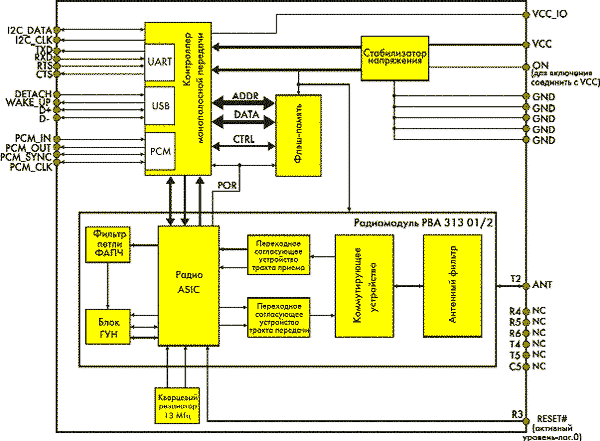 Каковы характерные особенности модуля? ГУН-генератор, управляемый напряжением, является частью системы ФАПЧ. В нем же осуществляется модуляция. Фильтр петли ФАПЧ обеспечивает фильтрацию управляющего напряжения ГУН. Контроллер монополосного сигнала выполнен на основе чипа ARM7TDMI. Помимо связи посредством одного из интерфейсов USB или UART он также обеспечивает связь посредством интерфейса для передачи речи PCM и интерфейса I2C. Флэш-память используется совместно с контроллером. Блок стабилизаторов формирует из напряжения питания VCC, равного 3,3 В, два напряжения: 2,8 В и 2,2 В. Генератор системы синхронизации стабилизирован кварцевым резонатором на частоту 13 МГц, что обеспечивает погрешность частоты не хуже ±0,002 %. Узел контроллера связан с радиомодулем посредством интерфейса управления основным устройством или хостом — HCI (Host Control Interface). При этом обеспечивается передача пакетов трех типов: