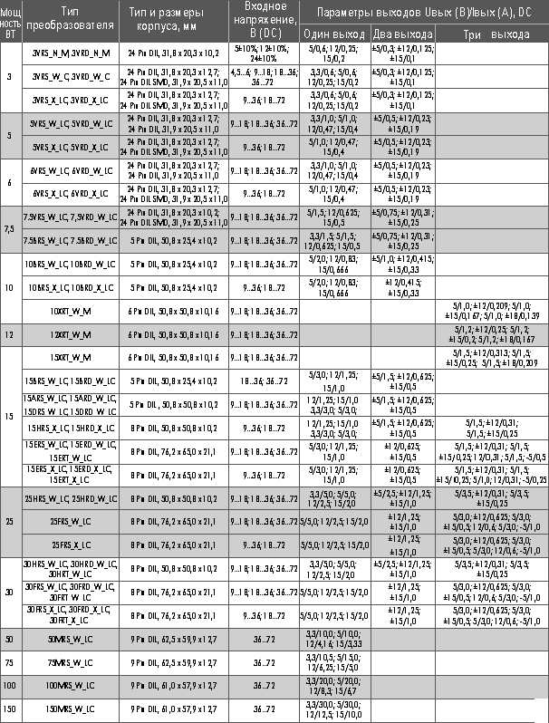 В табл. 1 приведены основные электрические характеристики DC/DC-преобразователей фирмы M+R Multitronik GmbH. Они позволяют оценить возможности преобразователей обеспечить требуемые мощности при заданных входных и выходных напряжениях (табл. 1).