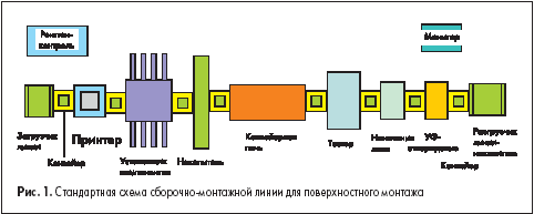 Основной интерес представляла экспозиция SMT-технологий, оборудования и материалов. В центре внимания была технологическая линия в последовательности операций: загрузка линии — трафаретное нанесение паяльной пасты на верхнюю сторону — визуальный контроль — нанесение клея на нижнюю сторону — визуальный контроль — установка компонентов на верхнюю сторону — визуальный контроль — установка компонентов на нижнюю сторону — визуальный контроль — оплавление паяльной пасты на верхней стороне и отверждение клея под компонентами нижней стороны в многозоновой конвейерной печи с нейтральной средой (азотом) — выгрузка плат с линии. Вне линии производят видеоконтроль, внутрисхемный электрический контроль с использованием «летающих щупов», исправление дефектов. Линия для пайки волной припоя стоит отдельно. Пайка волной производится в приспособлении, фиксирующем плату в плоскости. Последующий визуальный контроль совмещен с операциями исправления дефектов. X-Ray-контроль производится выборочно на стадии отладки процесса. На отдельном участке производится очистка поверхностей, нанесение защитного покрытия, его отверждение, упаковка. Эта самая распространенная схема стандартного процесса была частично представлена в одной линии семейством оборудования фирм BRADY, EKRA, SIEMENS DEMATIC, ROMMEL, REHM Anlagenbau, OMNITRON, SCORPION TECHNOLOGIES, PETER JORDAN, ARCCURE TECHNOLOGIES.