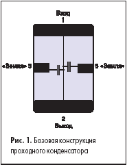 В отличие от стандартных, проходные конденсаторы имеют 3 полюса (4 внешних вывода). Между 1-м и 2-м полюсами этого конденсатора емкости нет (проходной конденсатор), а между 1-м и 3-м или 2-м и 3-м полюсами — есть. Базовая конструкция проходного конденсатора показана на рис. 1, а его графическое изображение — на схеме (рис. 2).