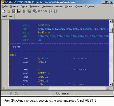 Далее была разработана принципиальная схема для управляющего блока, состоящая из микроконтроллера Atmel Corp. 90S2313 и семисегментного индикатора. Для микроконтроллера была разработана управляющая программа, осуществляющая сбор информации с других блоков по протоколу I2 C (рис.24).