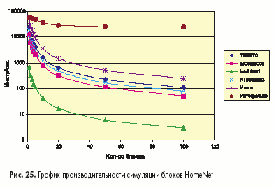 На рис. 25 изображены графики функций, отображающих зависимость производительности симуляции от количества блоков HomeNet (то есть фактически от числа моделируемых процессоров).