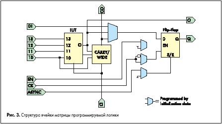 Массив конфигурируемой логики (Configurable System Logic, CSL — для разработчиков более привычен термин FPGA)предназначен для создания пользовательской периферии на одном кристалле с процессором и содержит, в зависимости от типа микросхемы, до 3200 логических ячеек.Каждая логическая ячейка (рис.3)содержит четырехвходовую таблицу перекодировки, схему расширителя ускоренного переноса, триггер с входами тактирования разрешения и сброса и подобна логической ячейке, применяемой в ПЛИС семейства XC4000 фирмы Xilinx. Ячейки конфигурируются при включении питания из внешней Flash-памяти или через JTAG-интерфейс от персонального компьютера в режиме отладки. Ячейки могут реализовывать комбинационную или последовательностную логику, могут быть сконфигурированы в качестве модулей памяти, в том числе и двухпортовой. В матрице конфигурируемой логики предусмотрены 6 глобальных сигналов с повышенной нагрузочной способностью, длинные и короткие связи для облегчения внутрикристальной разводки. Процесс проектирования аппаратной части устройства на встроенной матрице конфигурируемой логики имеет много общего с проектированием устройств на основе классических FPGA, особенностью является описание и моделирование взаимодействия аппаратной и программной части через механизм адресных селекторов и системную шину.