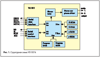 Микросхема состоит из быстродействующего сигнального процессора VS_DSP с низким потреблением мощности (см.рис.1), 4 кбайт памяти для служебных программ и 0,5 кбайт — для пользовательских, двух последовательных интерфейсов типа SPI (разработана и впервые применена фирмой Motorola). Управление схемой декодирования реализовано через SCI-интерфейс, прием цифровых данных через SDI. Кроме того, микросхема содержит быстродействующий сигма-дельта стерео-ЦАП и стереоусилитель для подключения наушников.