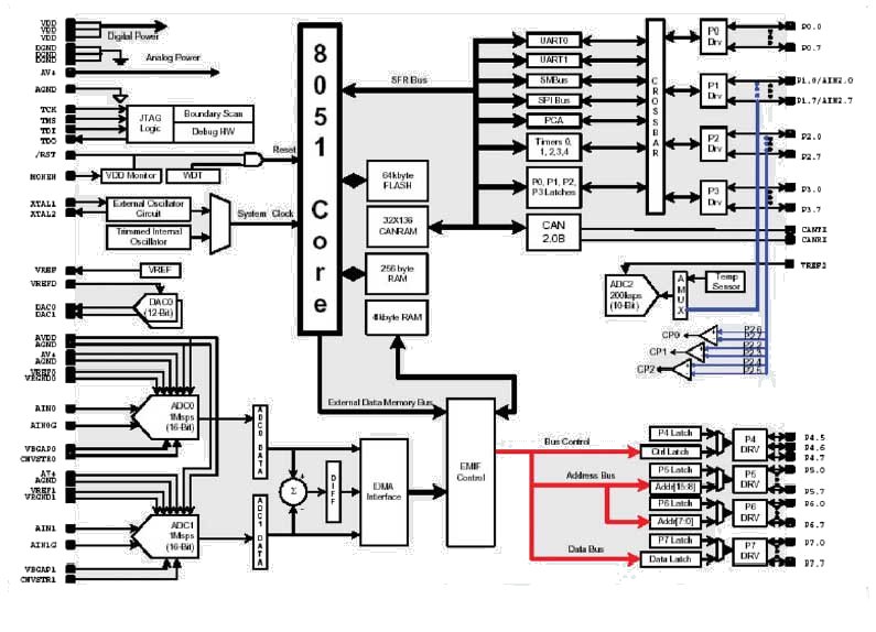 Самое «навороченное» семейство микроконтроллеров – C8051F060/1/2/3 (структура на рис. 1, блок-схема на рис. 2, таблица 2), в состав которого входят: контроллер 8051 на 25 MIPS, CAN 2,0В контроллер, память данных на (4К+256) байт, флэш-память на 64 кбайт, два 16-разрядных АЦП, один 10-разрядный АЦП, два 12-разрядных ЦАП и т.д. Эти т.д. будут рассмотрены ниже.
