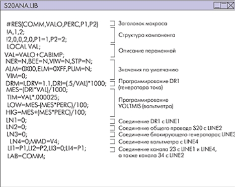 Данный макрос во время создания программы автоматически заносится в File.srg (основной программный модуль), который содержит информацию, необходимую для тестирования всех компонентов проверяемой платы, а соответствие макроса #RES и программных команд, которые управляют приборами и линиями, содержится в File.lib (файле библиотеки). На рис. 6 представлен фрагмент файла библиотеки S20ANA.LIB с описанием макроса пользователя #RES.