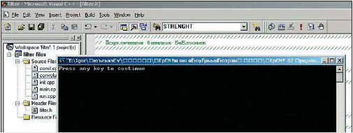 После запуска программы появится консольное окно, в котором, например, можно отобразить вычисленный программой результат или информацию о самом процессе выполнения. В конце выполнения программы в консольном окне появится надпись с предложением нажать любую кнопку для выхода из консольного окна (рис. 22).