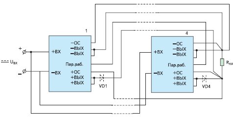 Выводы «Обратная связь», подключаемые к клеммам нагрузки, служат для компенсации падения напряжения в выходных соединительных проводах, что особенно важно для разветвленных систем электропитания. Схема параллельного включения показана на рис. 5.