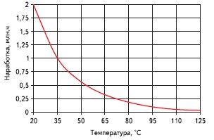 Надежность является основным критерием, определяющим выбор модулей питания. В модулях МДМ-ВТ исключены элементы с плохим временем наработки на отказ, отрицательно влияющие на надежность: вместо танталовых использованы керамические конденсаторы, оптическая развязка сигналов обратной связи заменена на трансформаторную. На рис. 6 приведена зависимость времени наработки на отказ модулей МДМ-ВТ от температуры корпуса. Расчетная наработка на отказ при температуре корпуса 35 °С составляет не менее 1 млн. часов, для 125 °С соответственно 30 тыс. часов.