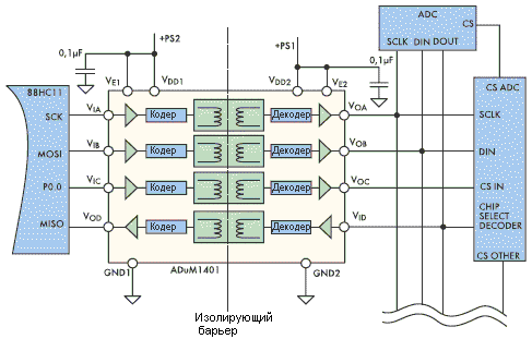 И, наконец, выпуском магнитоизоляторов занимается фирма Analog Devices. Свою технологию она называет iCoupler®, а изделия - iCoupler® isolators. Блок-схема устройства из описания одноканального прибора ADuM1100 [3] показана на рис. 2.